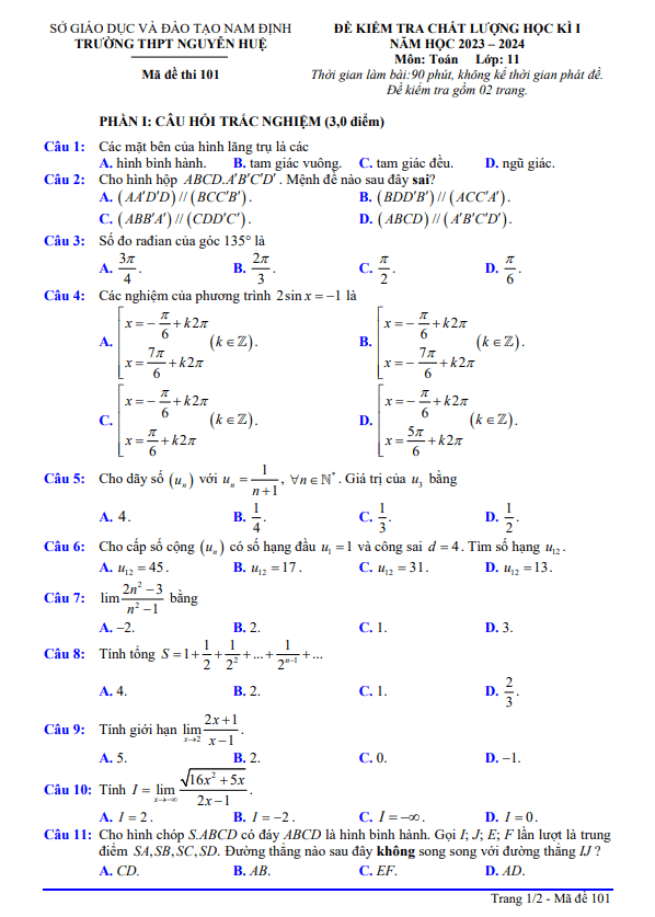Đề Thi HK1 Toán 11 Đề cuối kỳ 1 Toán 11 năm 2023 – 2024 trường THPT Trần Hưng Đạo – Khánh Hòa 03/01/2024