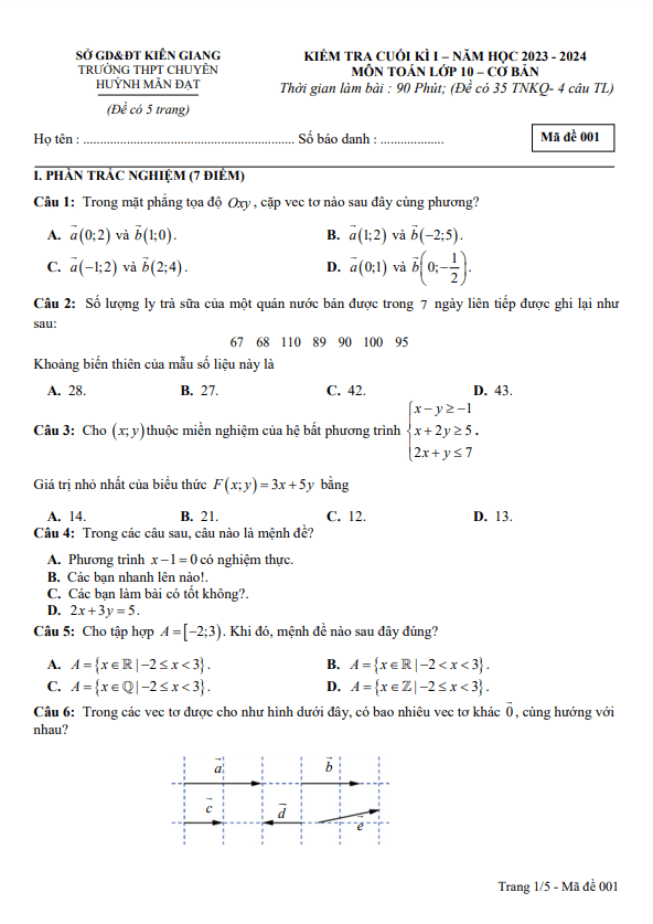 Đề Thi HK1 Toán 10 Đề cuối kì 1 Toán 10 năm 2023 – 2024 trường chuyên Huỳnh Mẫn Đạt – Kiên Giang 02/01/2024