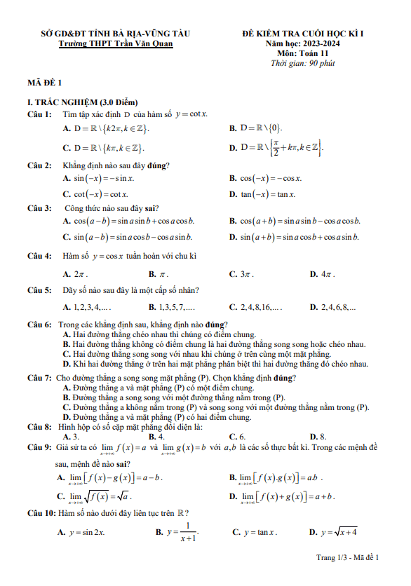 Đề Thi HK1 Toán 11 Đề cuối kì 1 Toán 11 năm 2023 – 2024 trường THPT Trần Quốc Toản – Đắk Lắk 02/01/2024