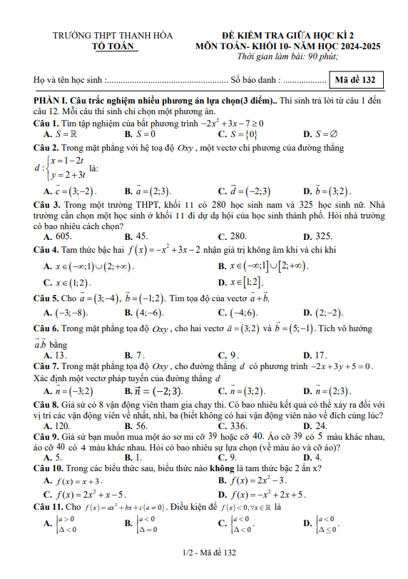 Đề giữa học kỳ 2 Toán 10 năm 2023 – 2024 trường THPT Đô Lương 3 – Nghệ An