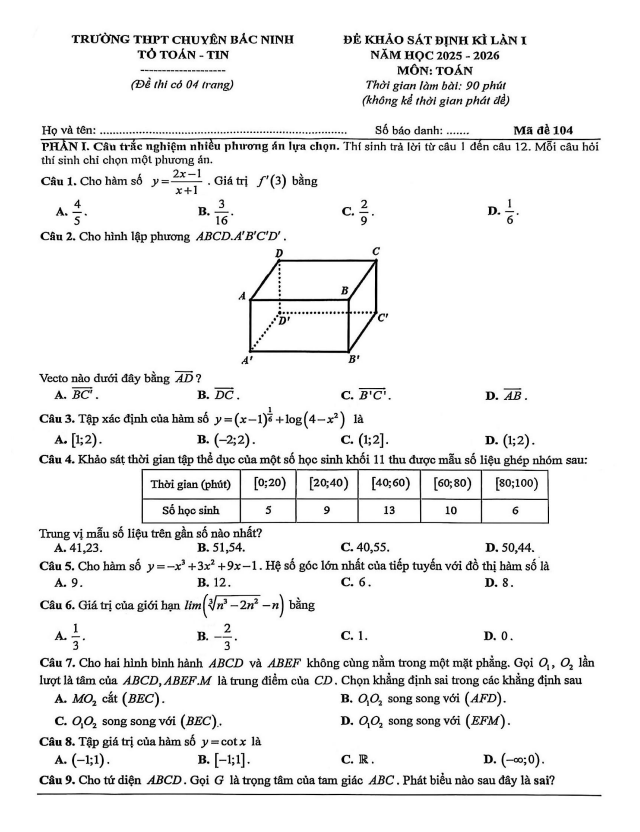 + Học sinh chọn một phương án trả lời đúng nhất theo yêu cầu của đề và làm bài trên giấy thi: Trong các hàm số sau, hàm số nào đồng biến trên R?