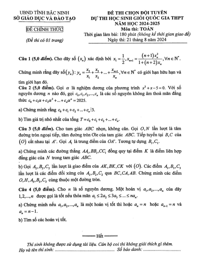 Đề Thi HSG Toán 12 Đề chọn đội tuyển thi HSG QG môn Toán THPT năm 2024 – 2025 sở GD&ĐT Bắc Ninh 22/08/2024