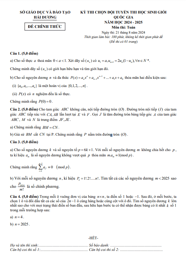 Đề Thi HSG Toán 12 Đề chọn đội tuyển thi HSG QG môn Toán THPT năm 2024 – 2025 sở GD&ĐT Hải Dương 24/08/2024