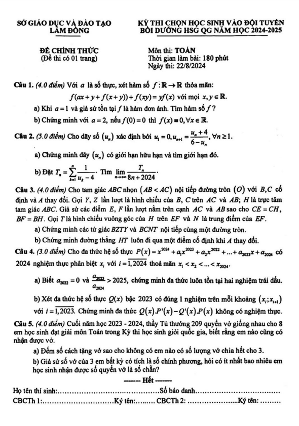 Đề Thi HSG Toán 12 Đề chọn đội tuyển thi HSG QG môn Toán THPT năm 2024 – 2025 sở GD&ĐT Lâm Đồng 23/08/2024