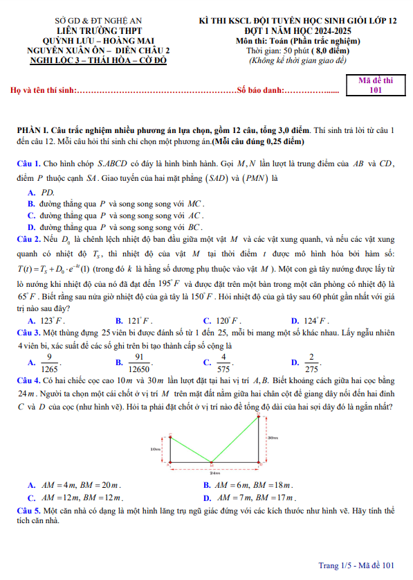 Đề Thi HSG Toán 12 Đề KSCL học sinh giỏi Toán 12 đợt 1 năm 2024 – 2025 liên trường THPT – Nghệ An 27/08/2024