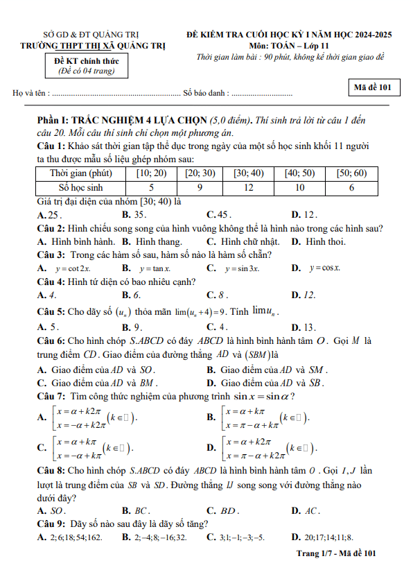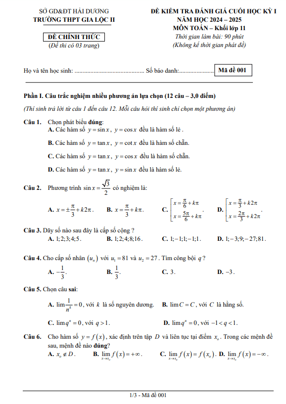 Đề Thi HK1 Toán 11 Đề cuối học kỳ 1 Toán 11 năm 2024 – 2025 trường THPT Gia Lộc 2 – Hải Dương 25/12/2024
