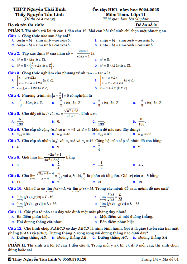 Đề Thi HK1 Toán 11 Đề ôn tập HK1 Toán 11 năm 2024 – 2025 trường THPT Nguyễn Thái Bình – TP HCM 21/12/2024