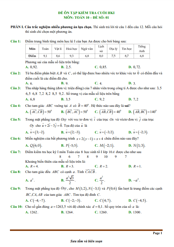 Đề Thi HK1 Toán 10 Đề minh họa cuối kỳ 1 Toán 10 năm 2024 – 2025 trường THPT Nguyễn Thái Bình – TP HCM 10/12/2024