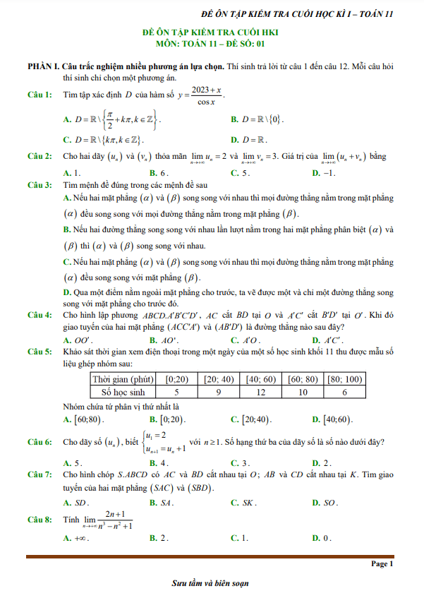 Đề Cương Ôn Tập Toán 11 Đề cương học kì 1 Toán 11 năm 2024 – 2025 trường THPT Bắc Thăng Long – Hà Nội 13/12/2024
