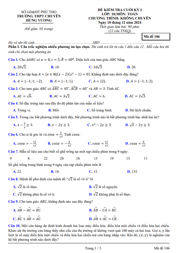 Đề Thi HK1 Toán 10 Đề cuối kỳ 1 Toán 10 năm 2024 – 2025 trường THPT chuyên Hùng Vương – Phú Thọ 16/12/2024
