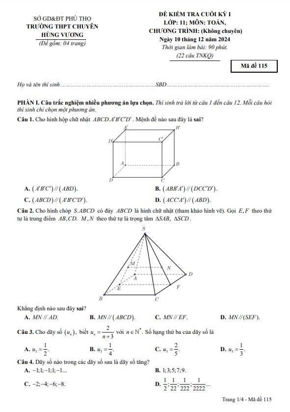 Đề Thi HK1 Toán 11 Đề cuối kỳ 1 Toán 11 năm 2024 – 2025 trường THPT chuyên Hùng Vương – Phú Thọ 14/12/2024