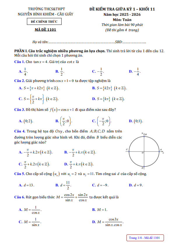 Trích dẫn Đề giữa học kỳ 1 Toán 11 năm 2025 – 2026 trường THPT Phan Đình Phùng – Hà Nội: