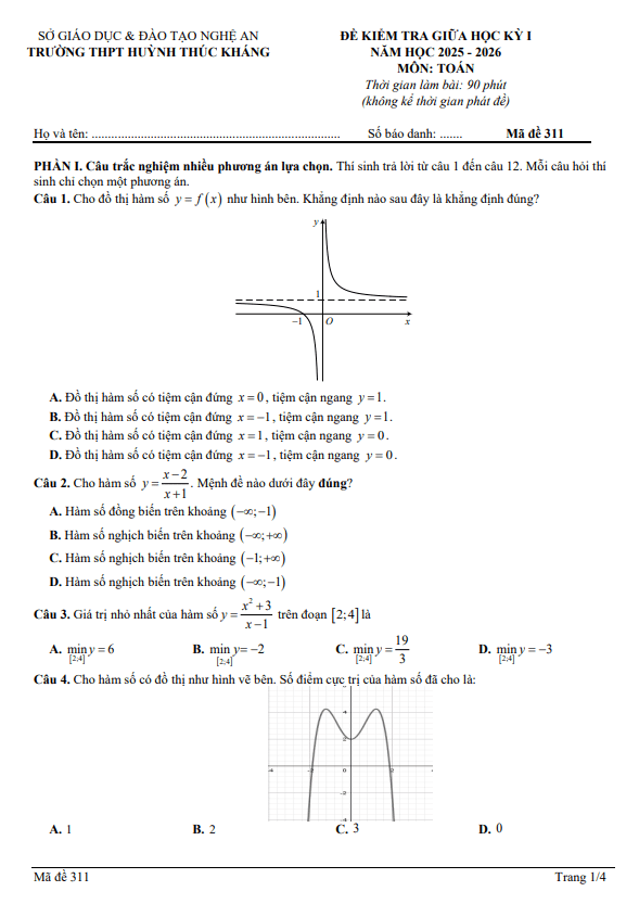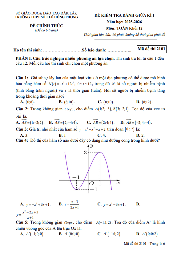 Trích dẫn Đề giữa kì 1 Toán 12 năm 2025 – 2026 trường Trần Cao Vân – TP HCM:
