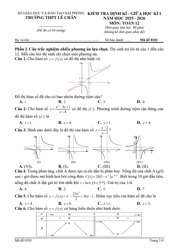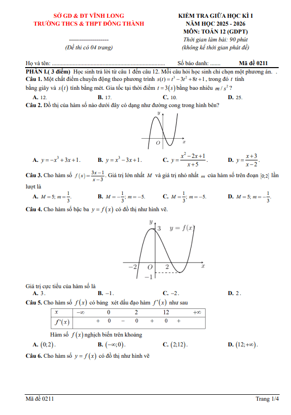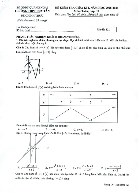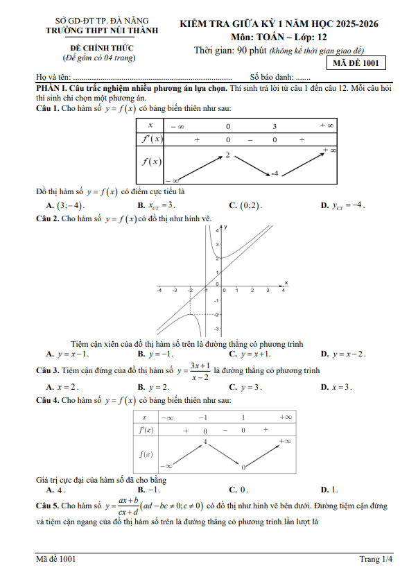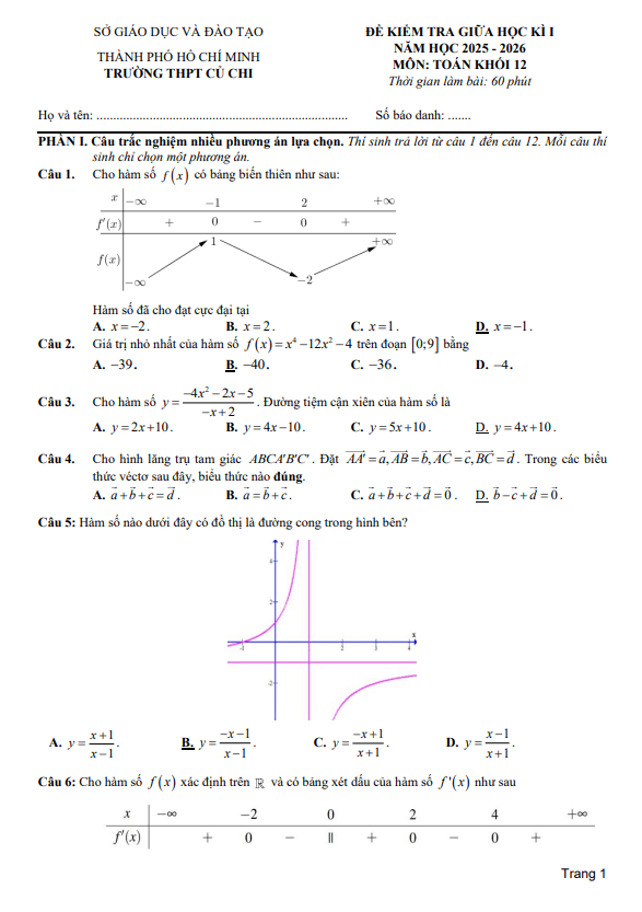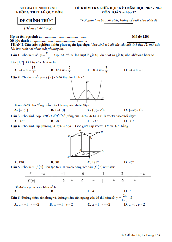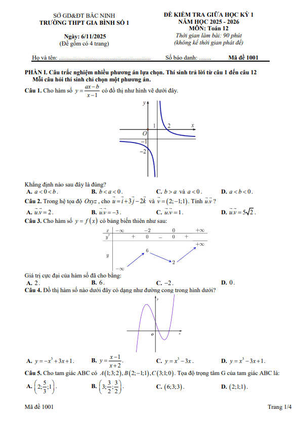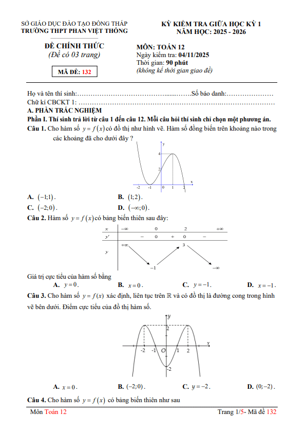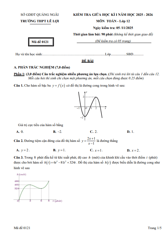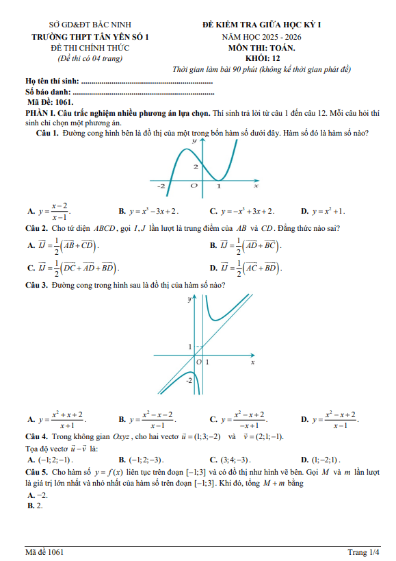 Trích dẫn Đề giữa học kỳ 1 Toán 12 năm 2025 – 2026 trường THPT Ngô Gia Tự 1 – Đắk Lắk: