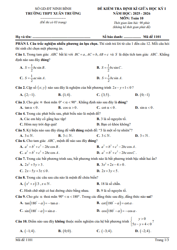 TOANMATH.com giới thiệu đến quý thầy, cô giáo và các em học sinh đề kiểm tra giữa học kì 1 môn Toán 10 năm học 2025 – 2026 trường THPT chuyên Vị Thanh, thành phố Cần Thơ. Đề thi có đáp án mã đề 1001 1002 1003 1004.