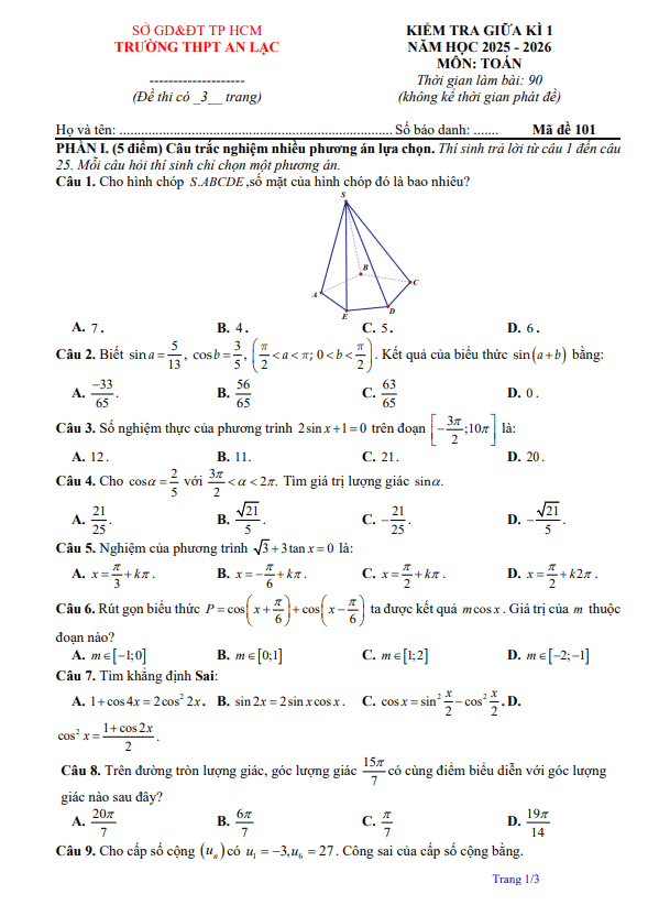 Đề giữa kì 1 Toán 11 năm 2025 – 2026 trường THPT An Lạc – TP HCM