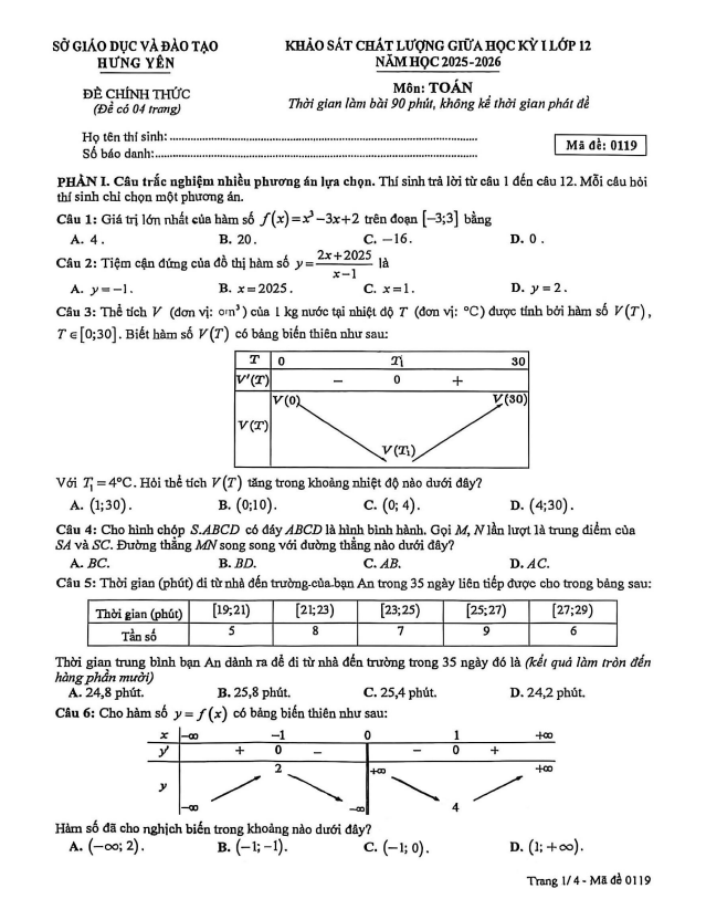 Trích dẫn Đề giữa kỳ 1 Toán 12 năm 2025 – 2026 trường THPT Hoa Lư A – Ninh Bình: