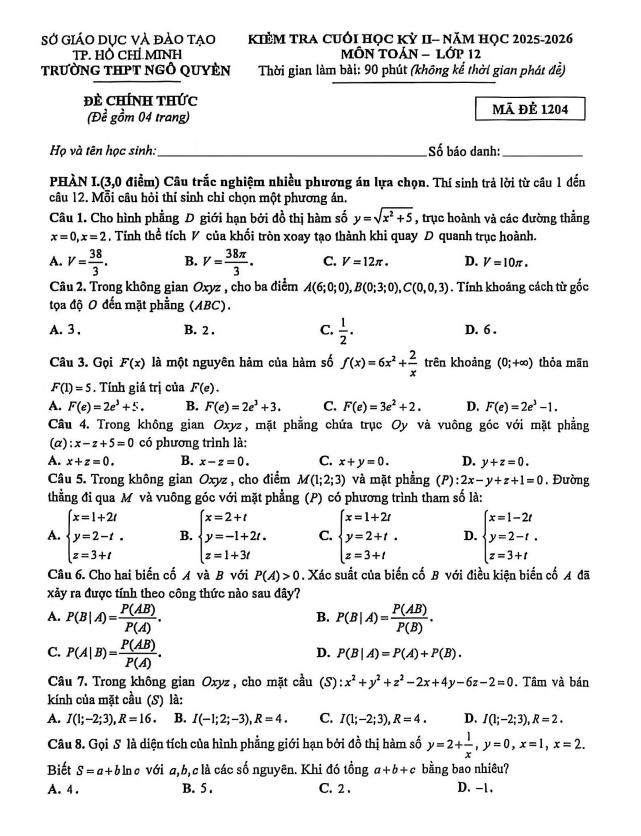 TOANMATH.com giới thiệu đến quý thầy, cô giáo và các em học sinh đề thi chọn học sinh giỏi văn hóa môn Toán 12 năm học 2025 – 2026 cụm chuyên môn số 3, tỉnh Bắc Ninh. Đề thi gồm 30 câu trắc nghiệm nhiều phương án lựa chọn (7,5 điểm) + 08 câu trắc nghiệm đúng sai (8,0 điểm) + 06 câu trắc nghiệm trả lời ngắn (4,5 điểm), thời gian làm bài 120 phút.