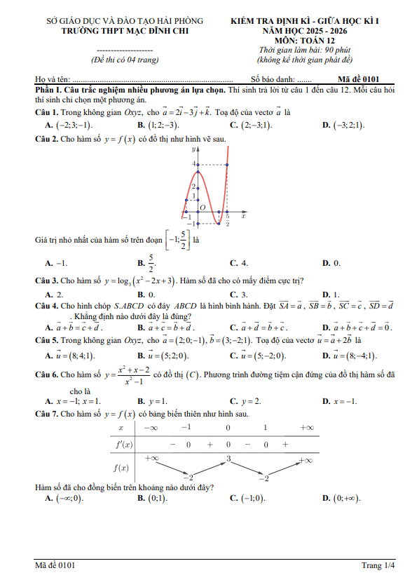 Đề giữa học kì 1 Toán 12 năm 2025 – 2026 trường THPT Mạc Đĩnh Chi – Hải Phòng