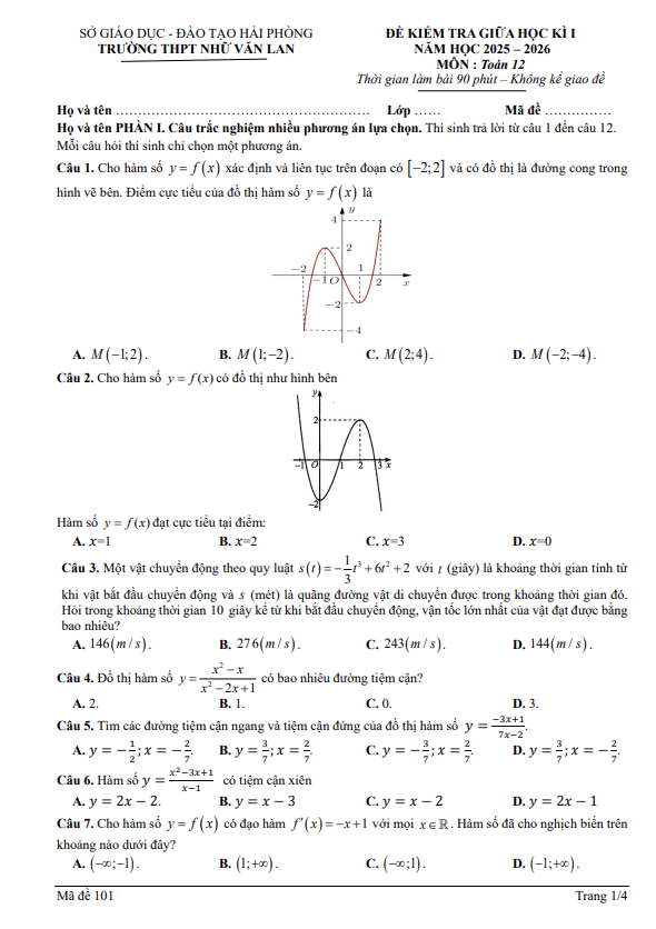Đề giữa học kì 1 Toán 12 năm 2025 – 2026 trường THPT Nhữ Văn Lan – Hải Phòng