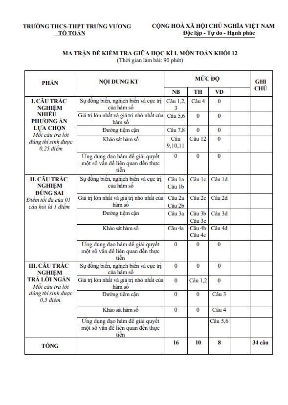Đề giữa học kì 1 Toán 12 năm 2025 – 2026 trường Trưng Vương – Vĩnh Long
