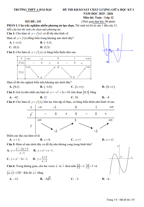 Đề giữa học kỳ 1 Toán 12 năm 2025 – 2026 trường THPT A Hải Hậu – Ninh Bình