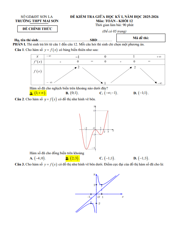 Đề giữa học kỳ 1 Toán 12 năm 2025 – 2026 trường THPT Mai Sơn – Sơn La