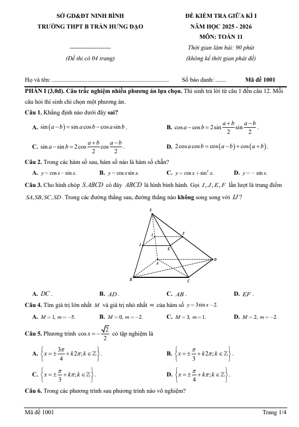 Đề giữa kì 1 Toán 11 năm 2025 – 2026 trường THPT B Trần Hưng Đạo – Ninh Bình