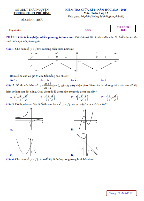 Đề giữa kì 1 Toán 12 năm 2025 – 2026 trường THPT Phú Bình – Thái Nguyên