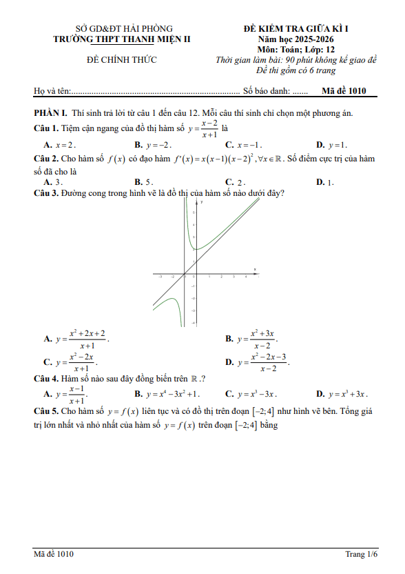 Đề giữa kì 1 Toán 12 năm 2025 – 2026 trường THPT Thanh Miện 2 – Hải Phòng