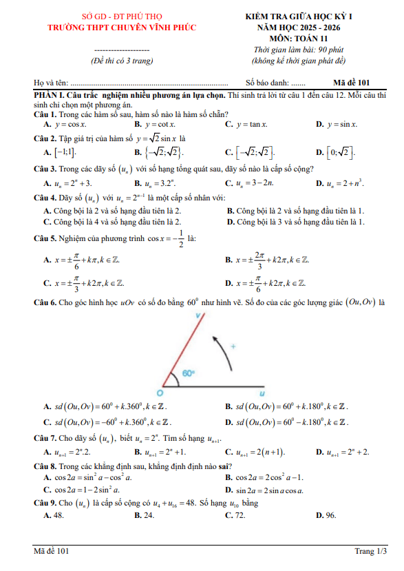Đề giữa kỳ 1 Toán 11 năm 2025 – 2026 trường THPT chuyên Vĩnh Phúc – Phú Thọ