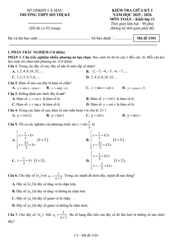 Đề giữa kỳ 1 Toán 11 năm 2025 – 2026 trường THPT Hồ Thị Kỷ – Cà Mau