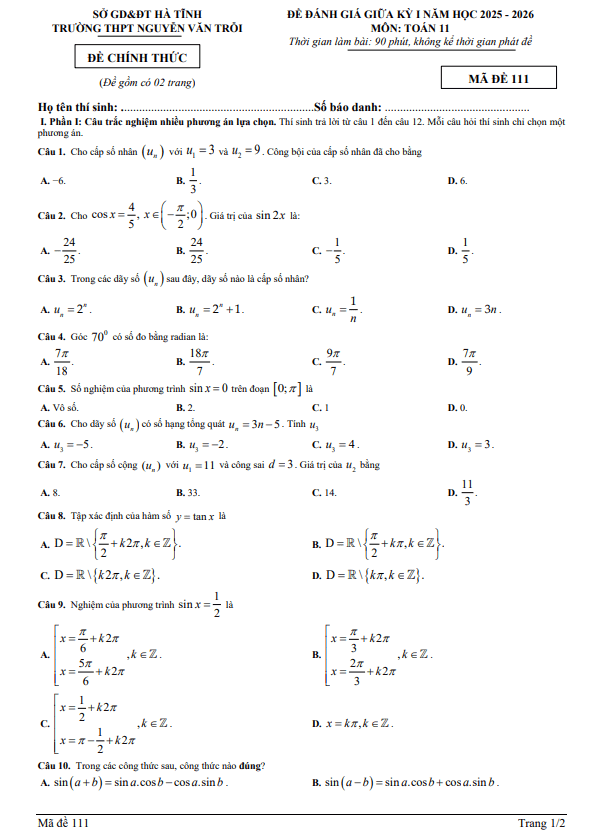Đề giữa kỳ 1 Toán 11 năm 2025 – 2026 trường THPT Nguyễn Văn Trỗi – Hà Tĩnh