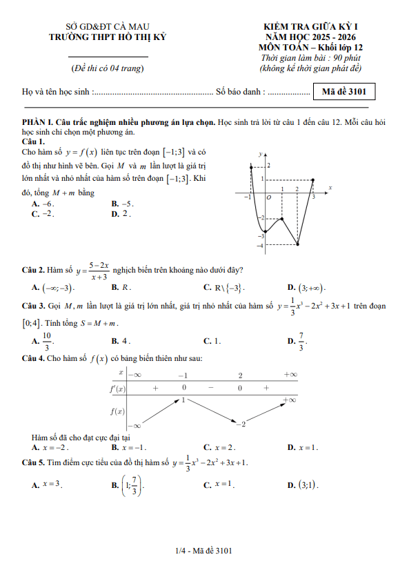 Đề giữa kỳ 1 Toán 12 năm 2025 – 2026 trường THPT Hồ Thị Kỷ – Cà Mau