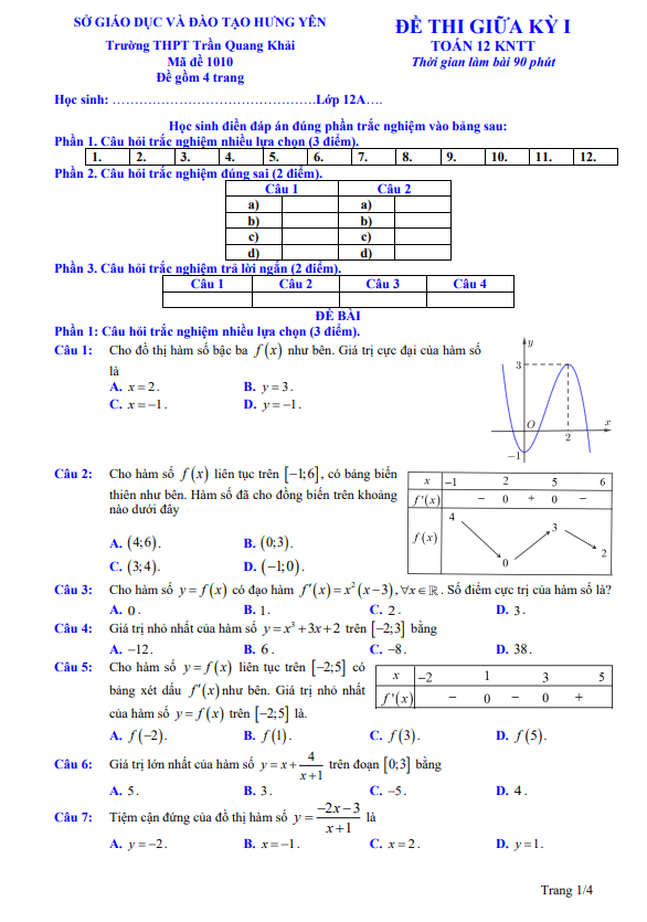 Đề giữa kỳ 1 Toán 12 năm 2025 – 2026 trường THPT Trần Quang Khải – Hưng Yên