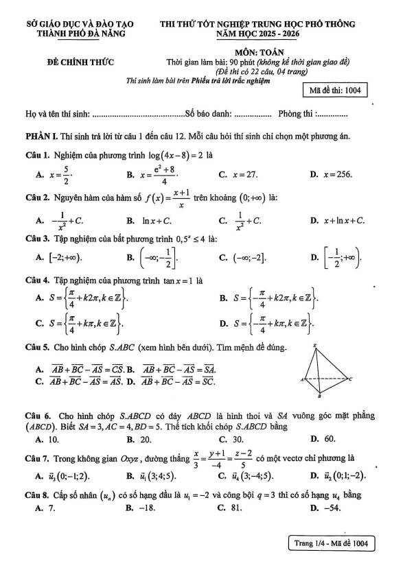 TOANMATH.com giới thiệu đến quý thầy, cô giáo và các em học sinh đề luyện tập kiểm tra cuối học kì 1 môn Toán 12 năm học 2025 – 2026 trường THPT Nguyễn Văn Thoại, thành phố Đà Nẵng. Đề thi gồm 12 câu trắc nghiệm nhiều phương án lựa chọn (3 điểm) + 02 câu trắc nghiệm đúng sai (2 điểm) + 04 câu trắc nghiệm trả lời ngắn (2 điểm) + 03 câu tự luận (3 điểm), thời gian làm bài 90 phút.