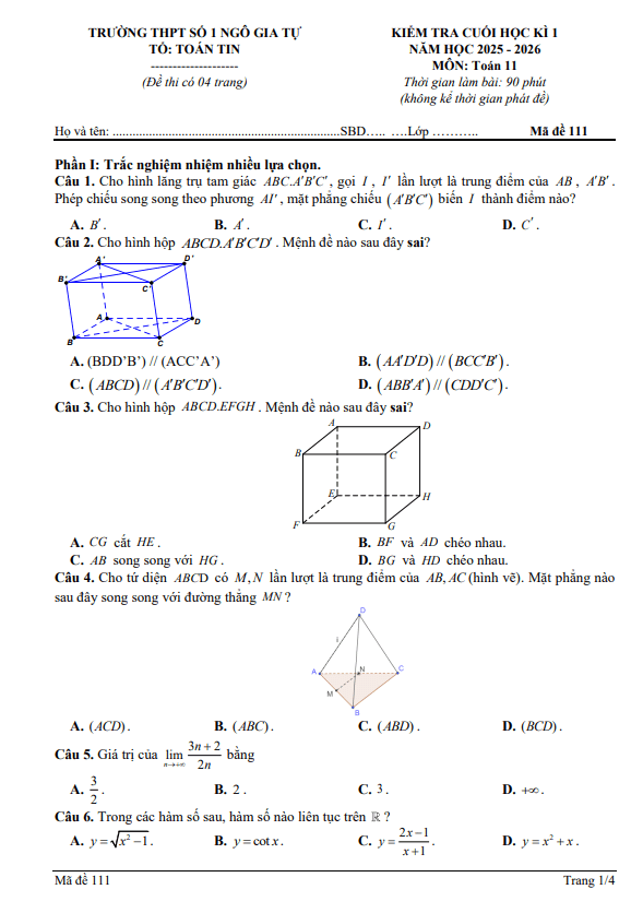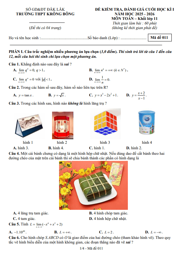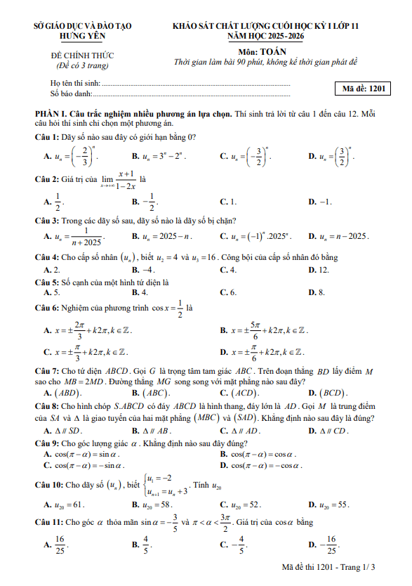 Trích dẫn Đề cuối kỳ 1 Toán 11 năm 2025 – 2026 trường THPT Quảng Trị – Quảng Trị: