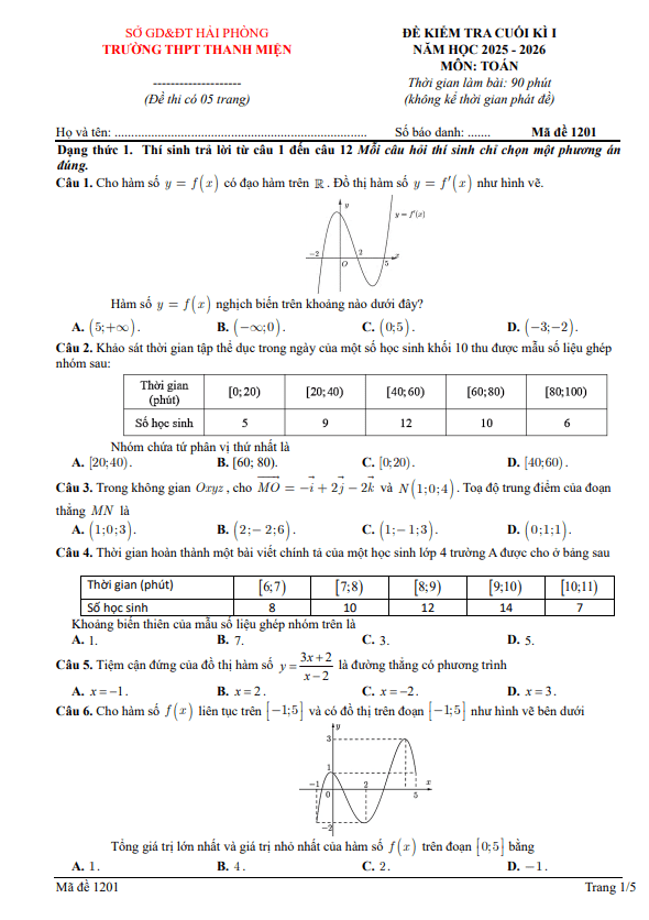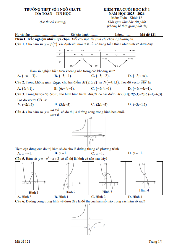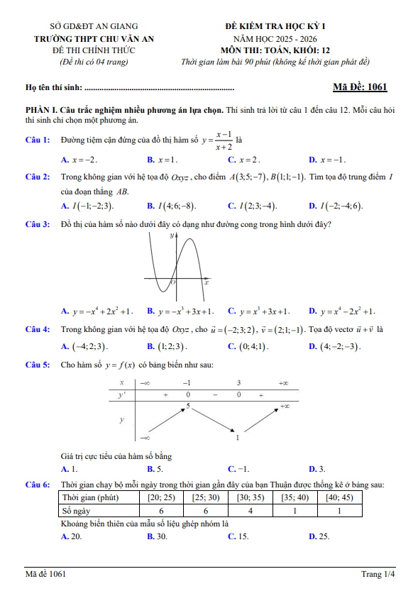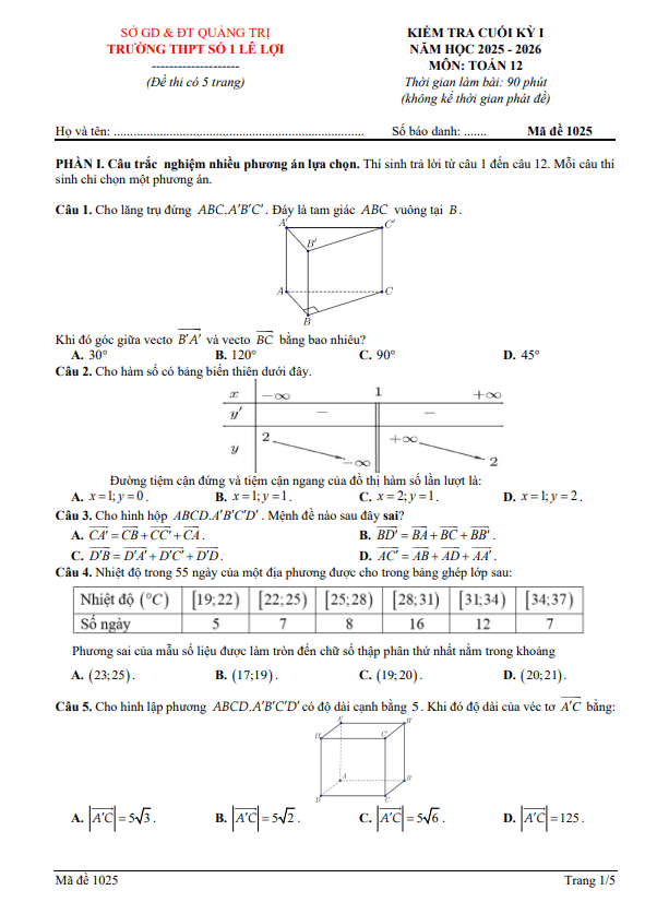 Trích dẫn Đề cuối kỳ 1 Toán 12 năm 2025 – 2026 trường THPT Quảng Trị – Quảng Trị: