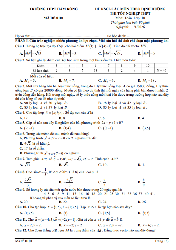 Trích dẫn Đề khảo sát lần 1 Toán 10 năm 2025 – 2026 trường THPT Triệu Sơn 3 – Thanh Hóa: