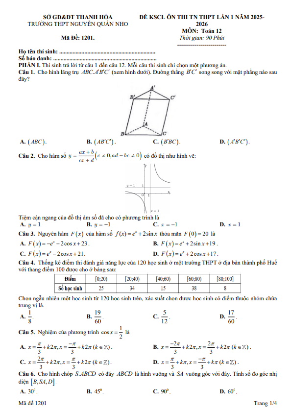 Trích dẫn Đề khảo sát lần 1 Toán 12 năm 2025 – 2026 trường THPT Triệu Sơn 3 – Thanh Hóa: