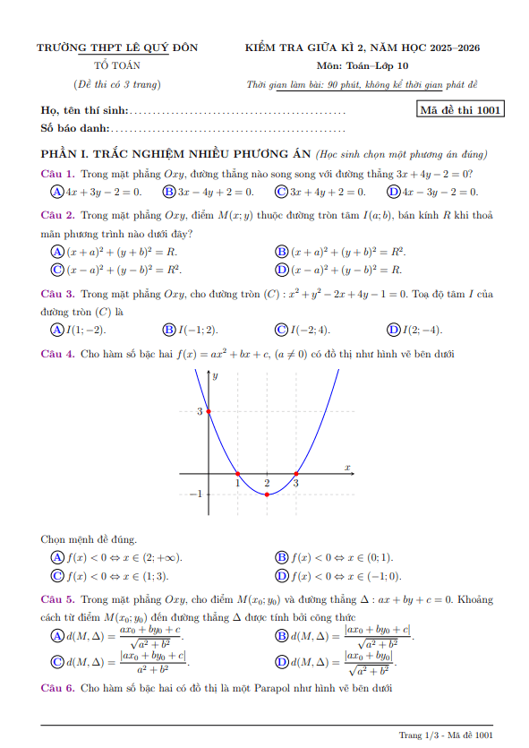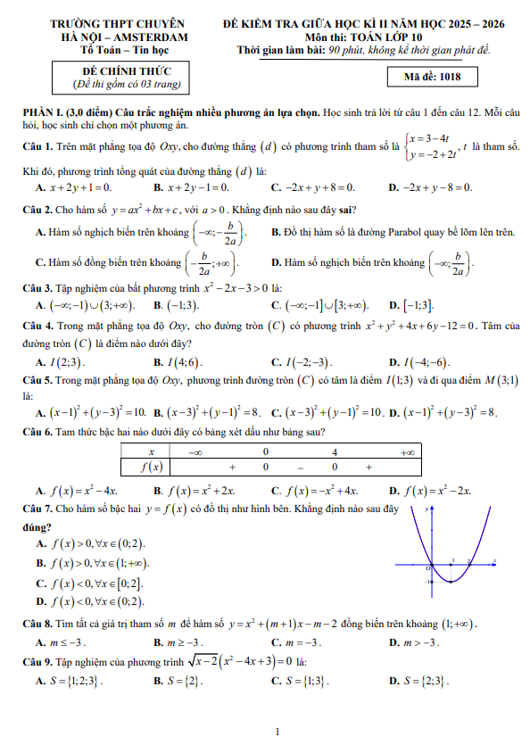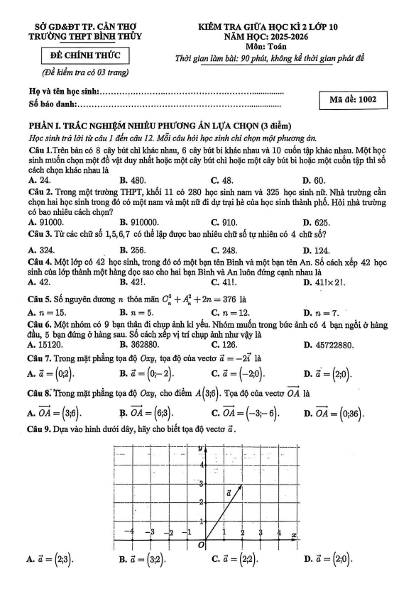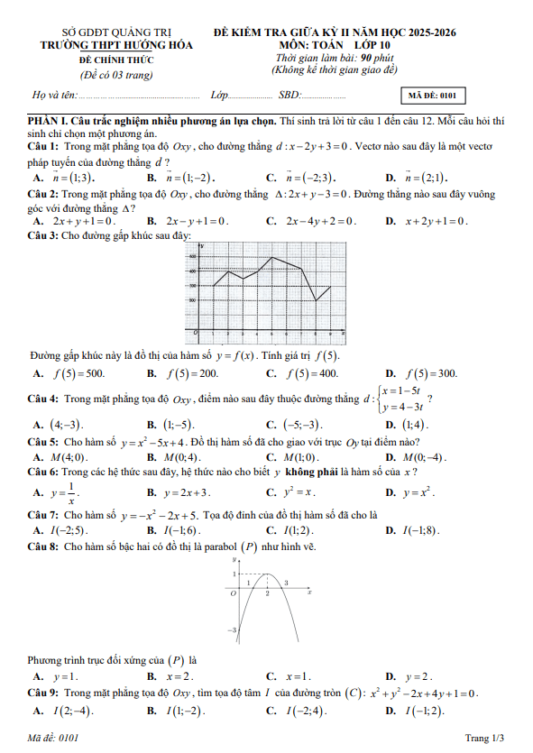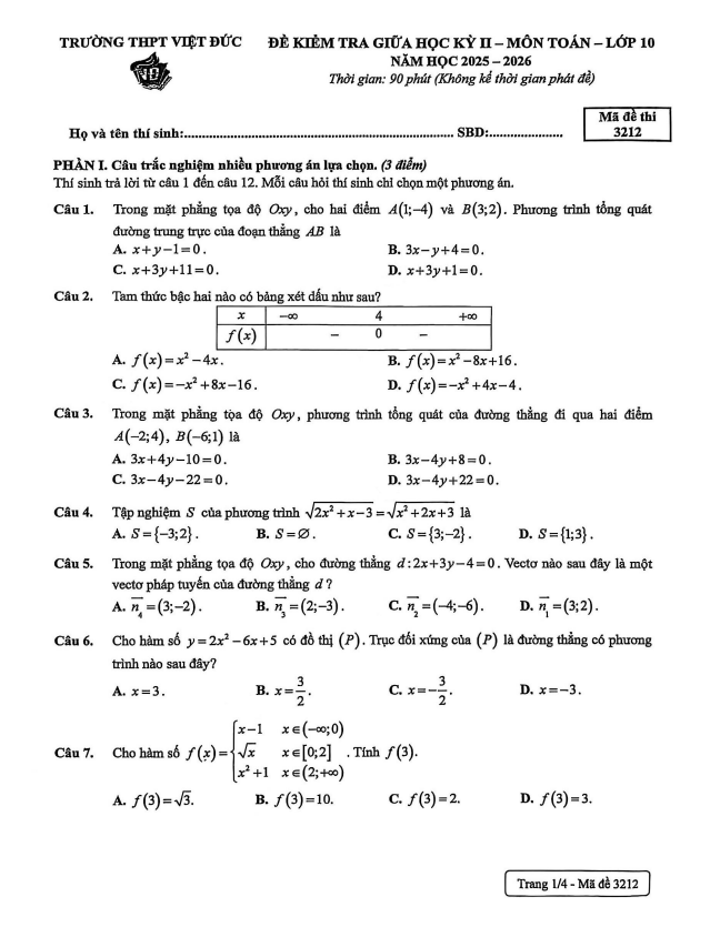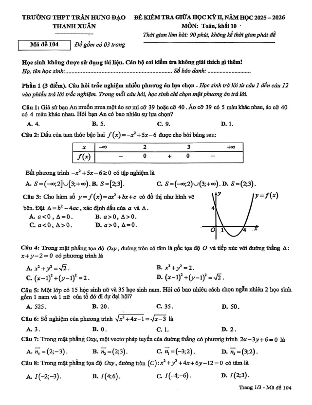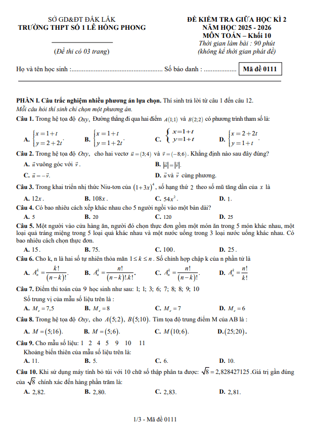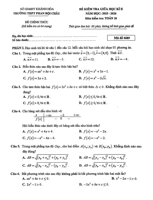 Trích dẫn Đề giữa học kỳ 2 Toán 10 năm 2025 – 2026 trường THPT Gia Bình 1 – Bắc Ninh: