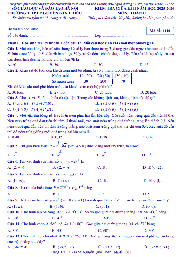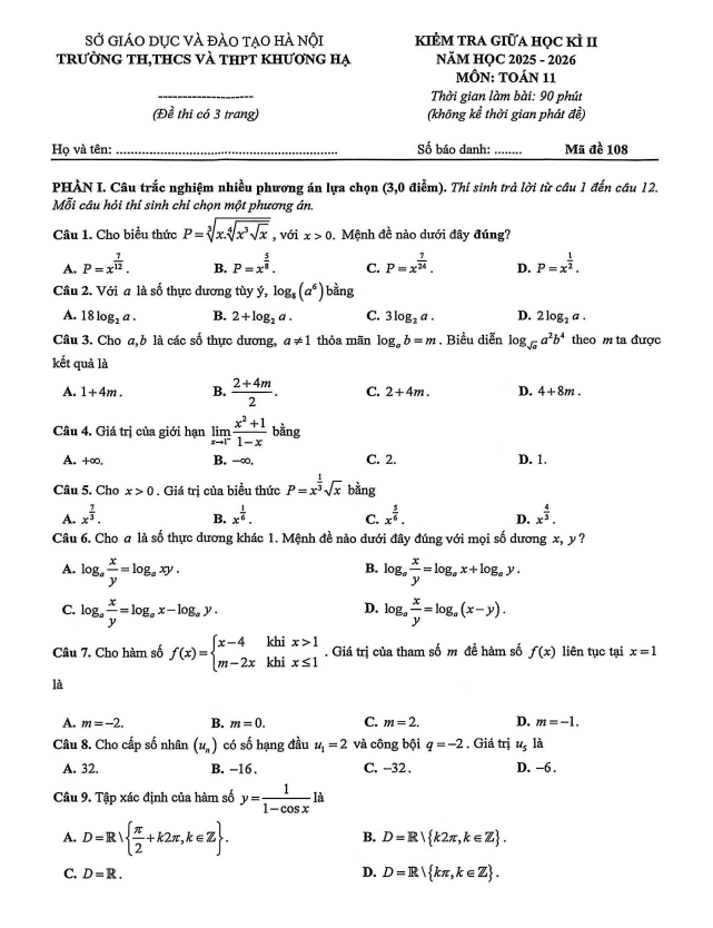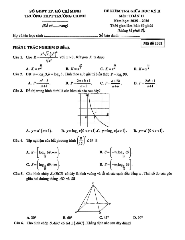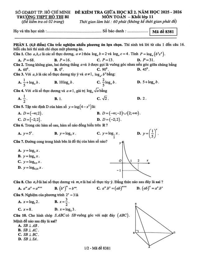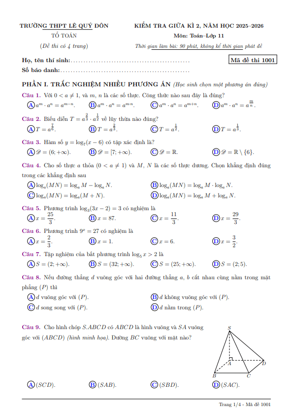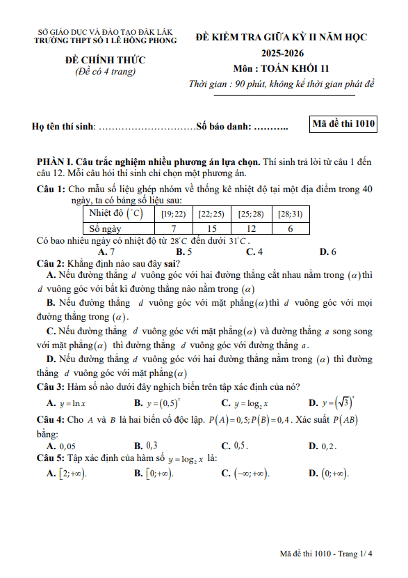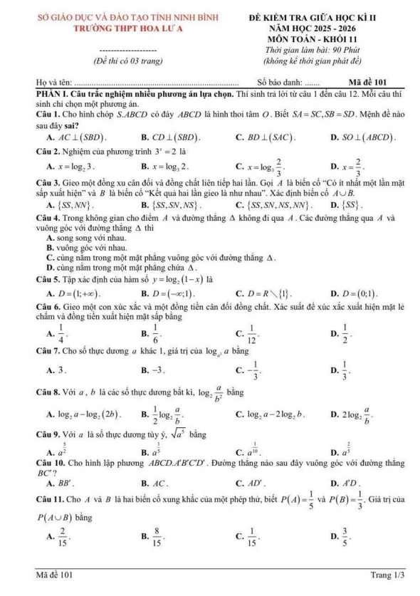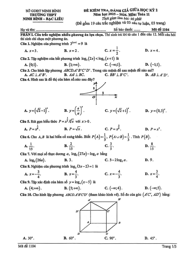 Trích dẫn Đề giữa học kỳ 2 Toán 11 năm 2025 – 2026 trường THPT Gia Bình 1 – Bắc Ninh: