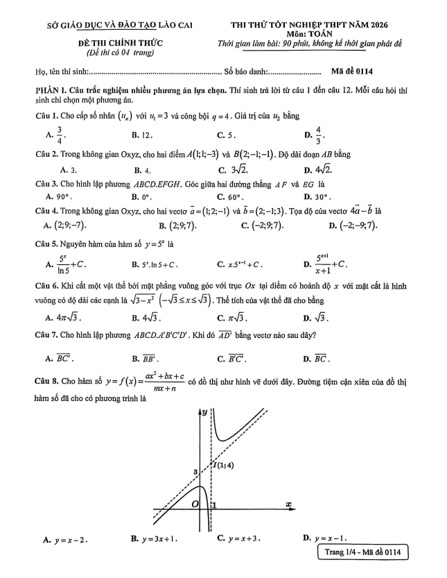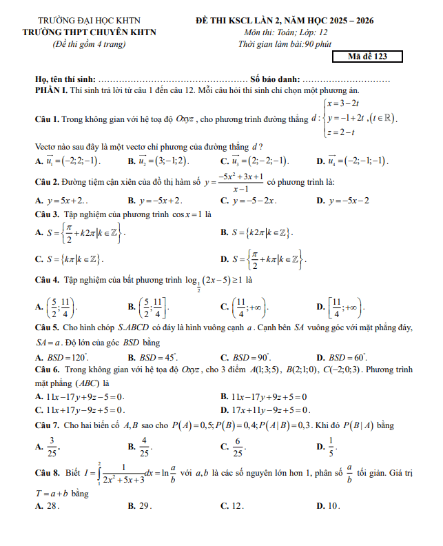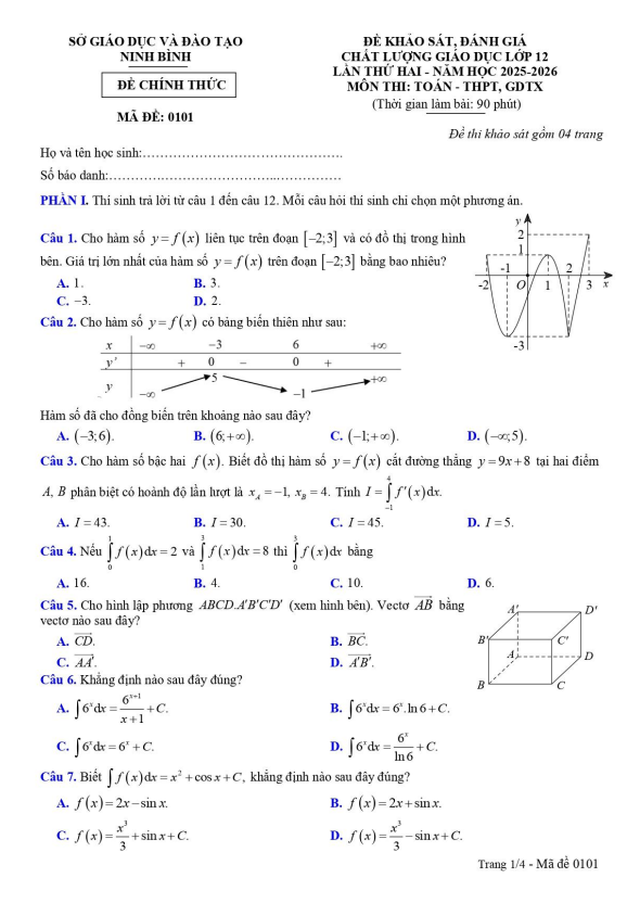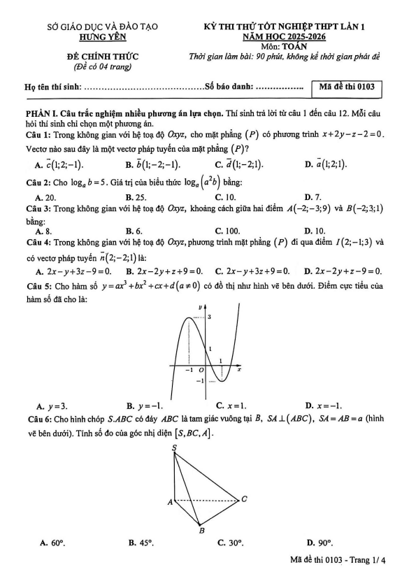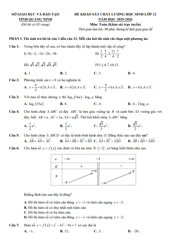 Trích dẫn Đề khảo sát Toán 12 lần 1 năm 2025 – 2026 sở GD&ĐT Thanh Hóa: