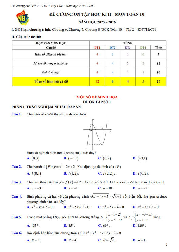 Đề cương cuối học kì 2 Toán 10 năm 2025 – 2026 trường THPT Việt Đức – Hà Nội