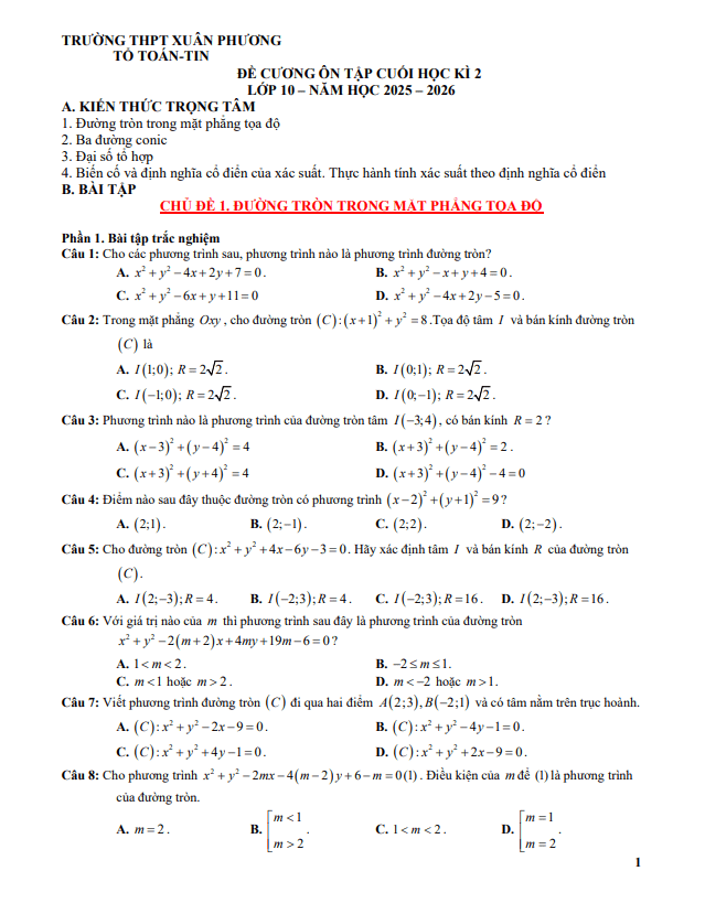 Đề cương cuối học kì 2 Toán 10 năm 2025 – 2026 trường THPT Xuân Phương – Hà Nội