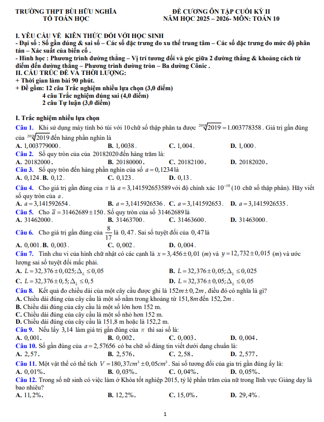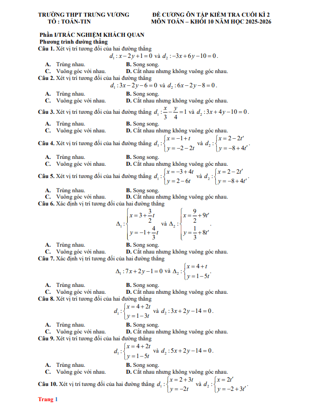 Đề cương cuối kỳ 2 Toán 10 năm 2025 – 2026 trường THPT Trưng Vương – Gia Lai