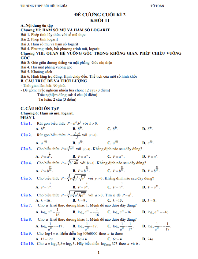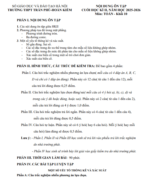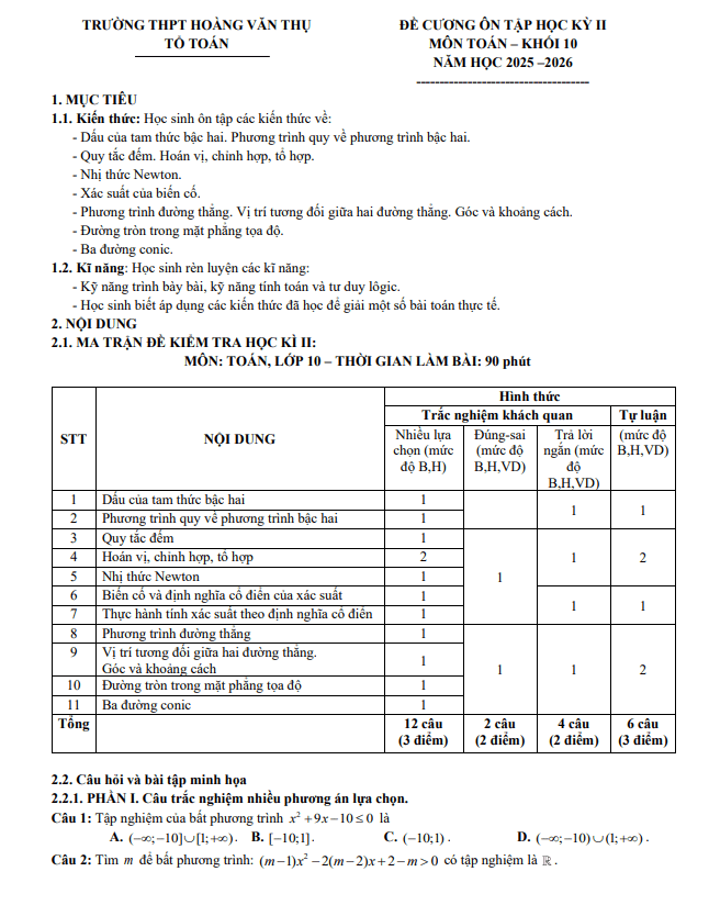 Đề cương cuối kỳ 2 Toán 10 năm 2025 – 2026 trường THPT Hoàng Văn Thụ – Hà Nội