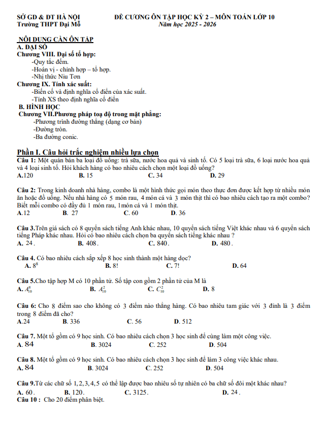 Đề cương học kỳ 2 Toán 10 năm 2025 – 2026 trường THPT Đại Mỗ – Hà Nội