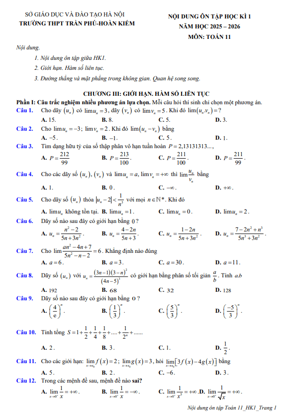 Đề cương giữa kỳ 1 Toán 11 năm 2025 – 2026 trường THPT Hoàng Văn Thụ – Hà Nội