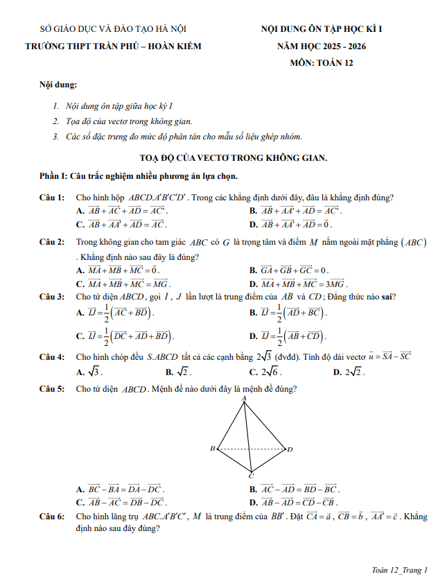 Ôn tập giữa học kì 1 Toán 12 năm 2025 – 2026 trường THPT Trần Phú – Hà Nội